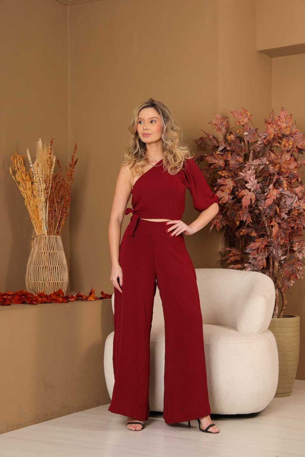 Este conjunto é a escolha ideal para quem deseja unir sofisticação, conforto e um toque fashionista. Composto por uma calça pantalona fluida e um cropped de um ombro só com detalhe em nó, o modelo valoriza a silhueta com muita elegância e presença.
