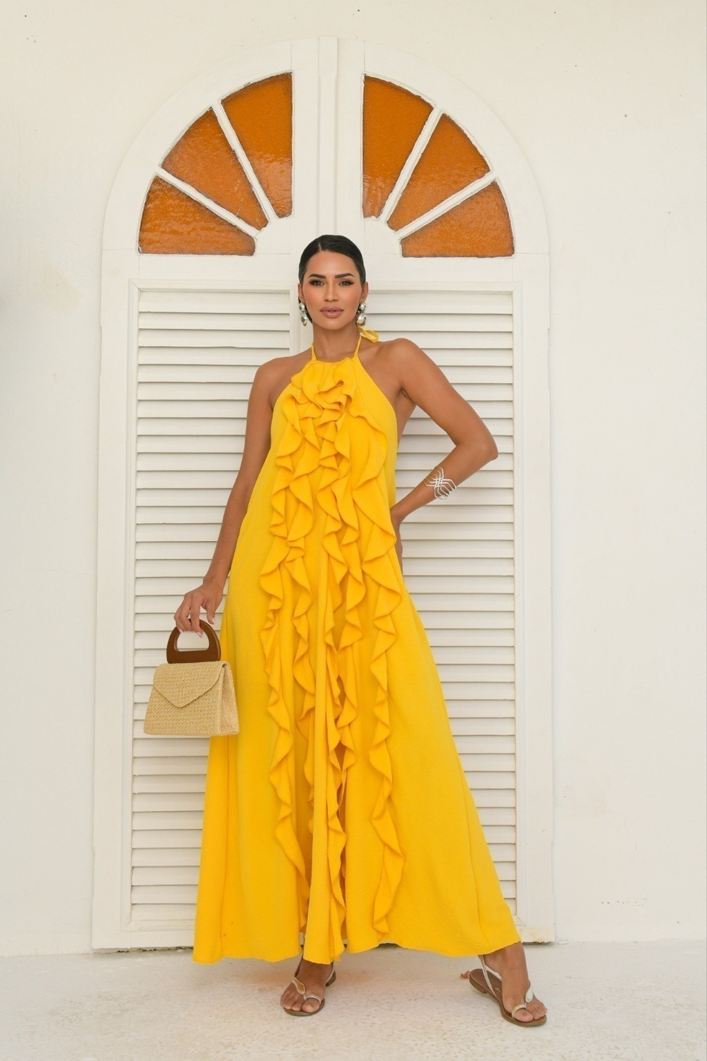 Apresentamos o vestido longo com alça e babado, confeccionado em tecido duna crepe, que combina leveza e elegância. Com bojo de amarrar, este vestido oferece um ajuste perfeito e confortável ao busto. O babado adiciona um toque de delicadeza e movimento ao design, ideal para ocasiões especiais ou eventos formais. Perfeito para quem busca um visual sofisticado e moderno, este vestido é uma escolha encantadora para qualquer evento que exija um estilo marcante e cheio de personalidade.
